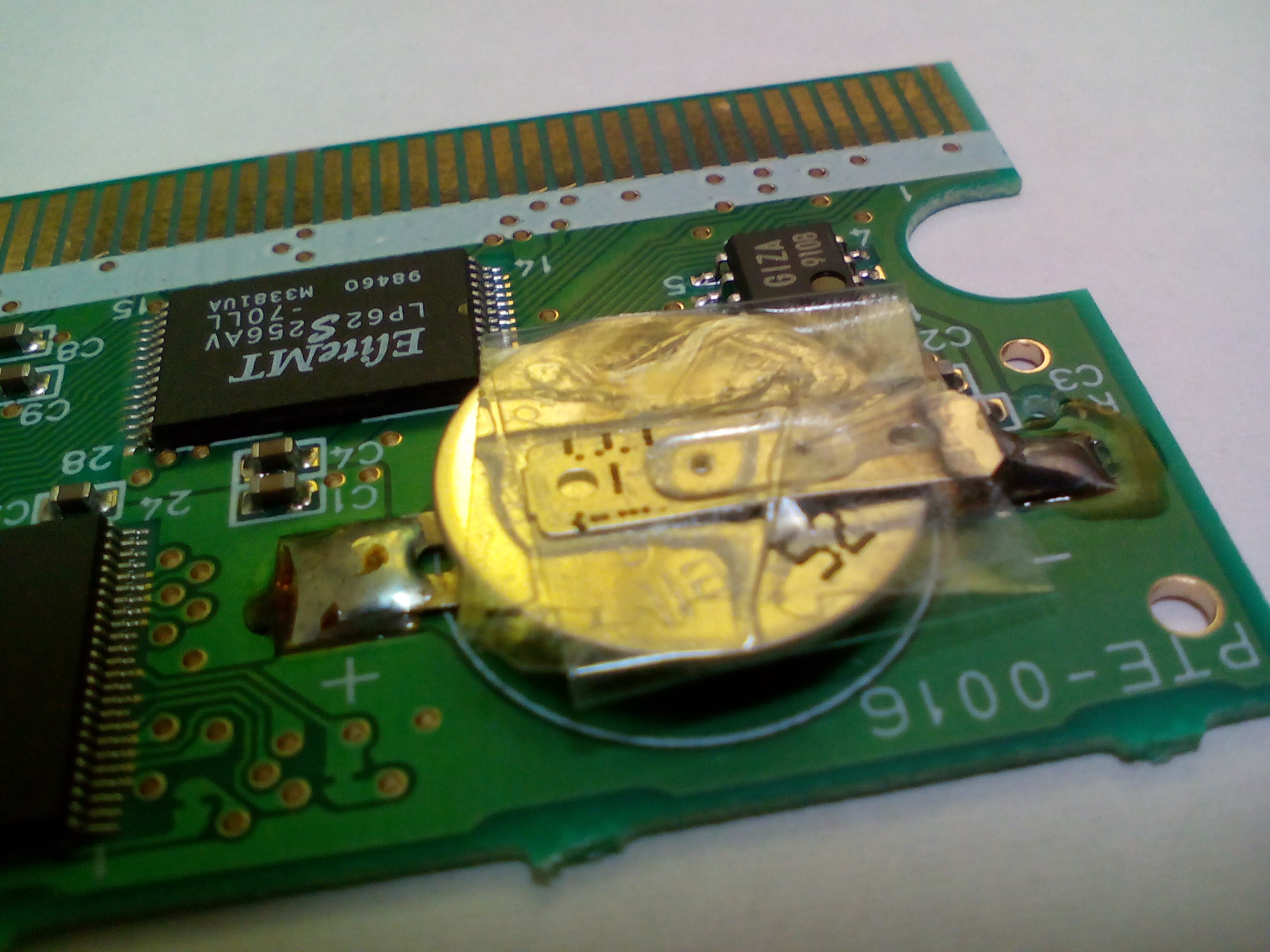 はい、こんな感じでテープを固定しておけばOKです。ちなみに上記の写真は電池のプラスとマイナスの向きを間違えて取り付けてしまっています!!!当然プラスとマイナスを間違えるとセーブは出来ません。